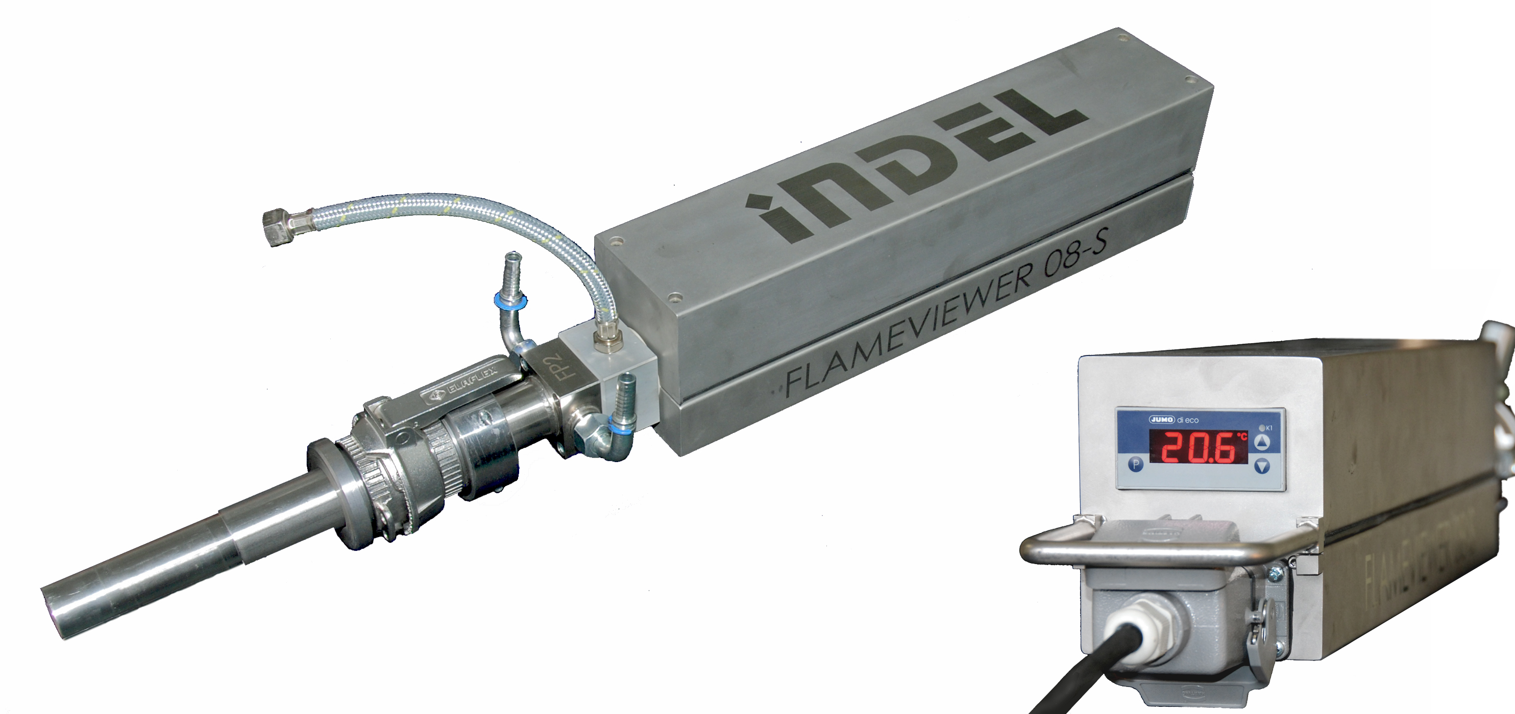 OBR. Flameviewer 08 pre stacionárne aplikácie. Do priezoru sa upevní rýchlospojkou. Zadná stena je osadená digitálnym relé s ukazovateľom teploty sondy.
